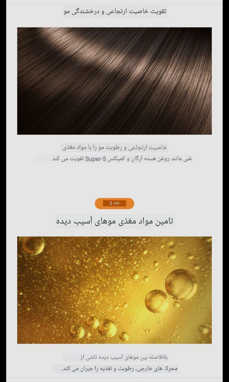 ♥️حاوی روغن آرگان که سرشار از ویتامینهای A ، E و C و اسیدهای چرب است که در تقویت موها، نرم کنندگی موها تاثیر شگفت انگیزی دارد .