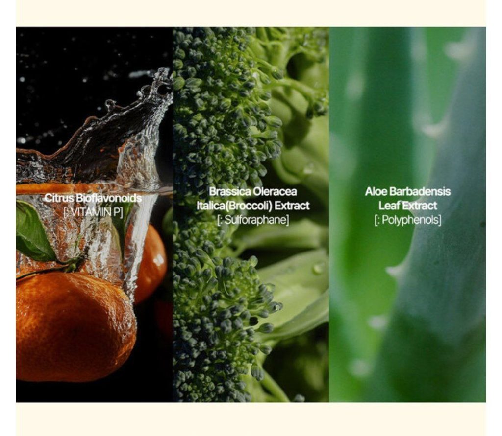_ حاوی فلاونوئیدهای مرکبات، عصاره کلم بروکلی و عصاره برگ آلوئه ورا است که اثرات آنتی اکسیدانی دارد و به فعال شدن آنزیم های سم زدایی کمک می کند.